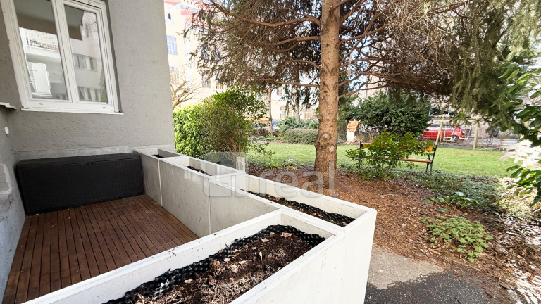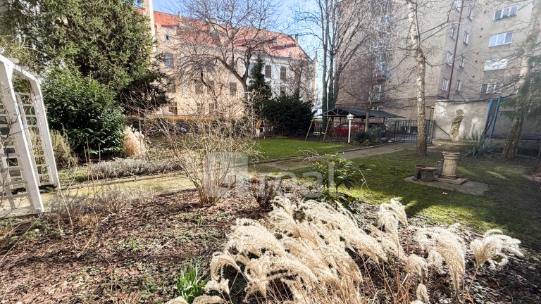Priame prepojenie bytu z obývacej izby do spoločnej záhrady vytvára príjemný pocit priestoru, súkromia a kontaktu s prírodou – čo je v centre mesta skutočnou raritou.